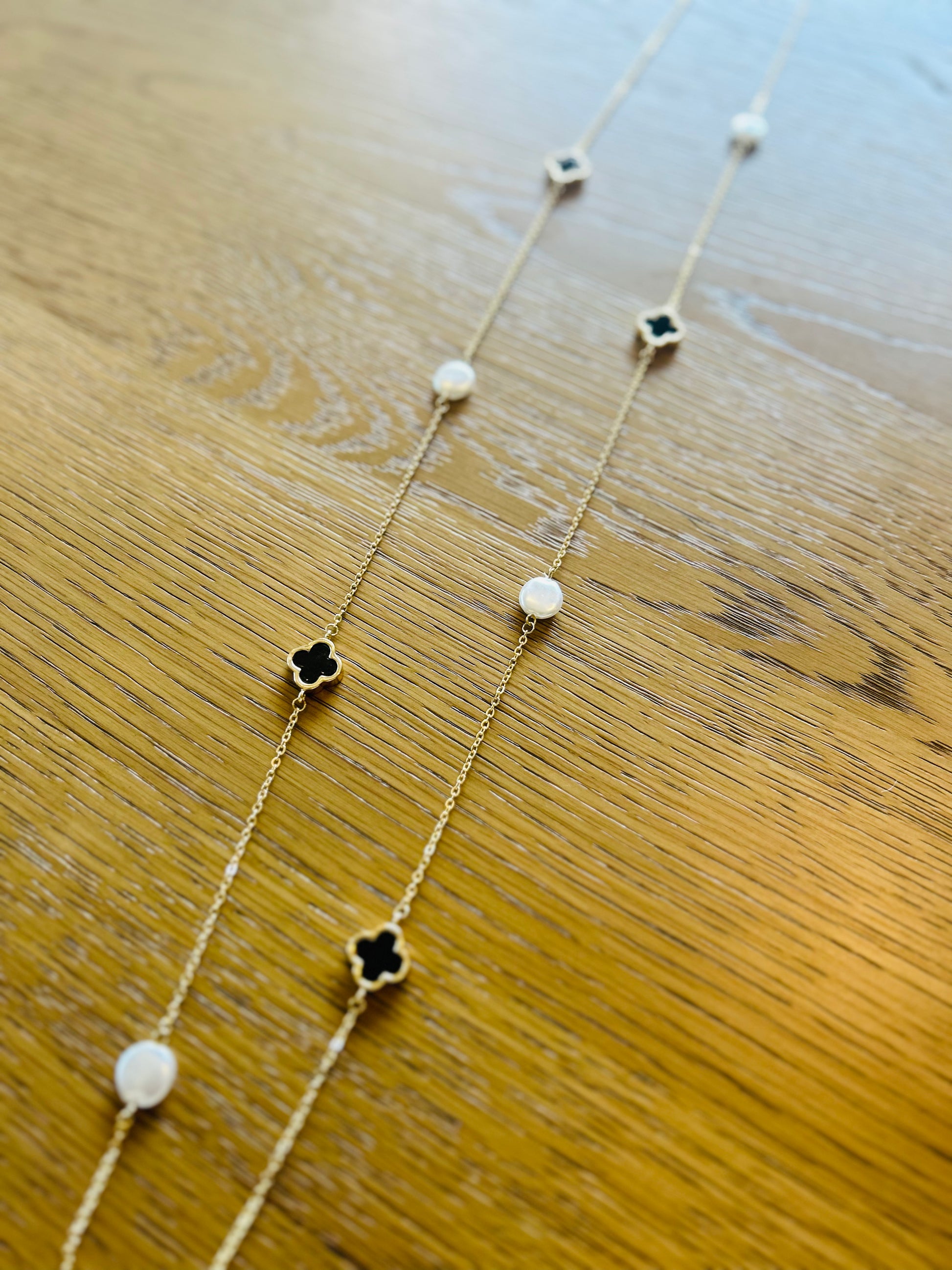 It does not get better than the Lena necklace! This necklace is 36 inches long features pearl accents and black enamel clovers. Great for layering with all of your other gold accessories.