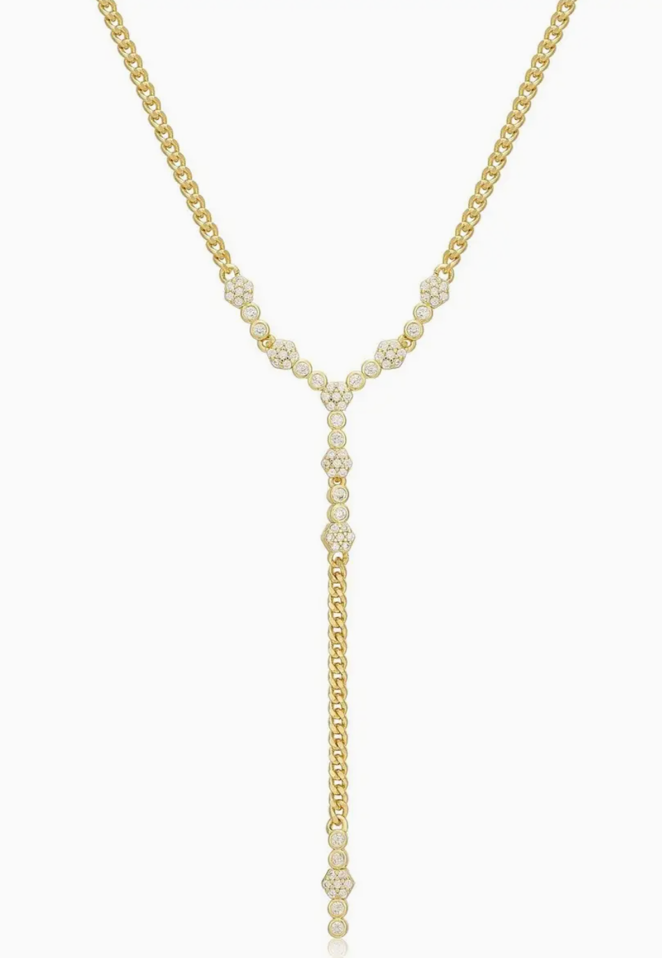 Elevate your everyday style with this striking curb chain lariat necklace, featuring pavé-encrusted hexagon beads and bezel-set round cubic zirconia stones for a touch of modern sparkle. Crafted from high-quality brass and plated in radiant gold, this necklace combines elegance with edge.