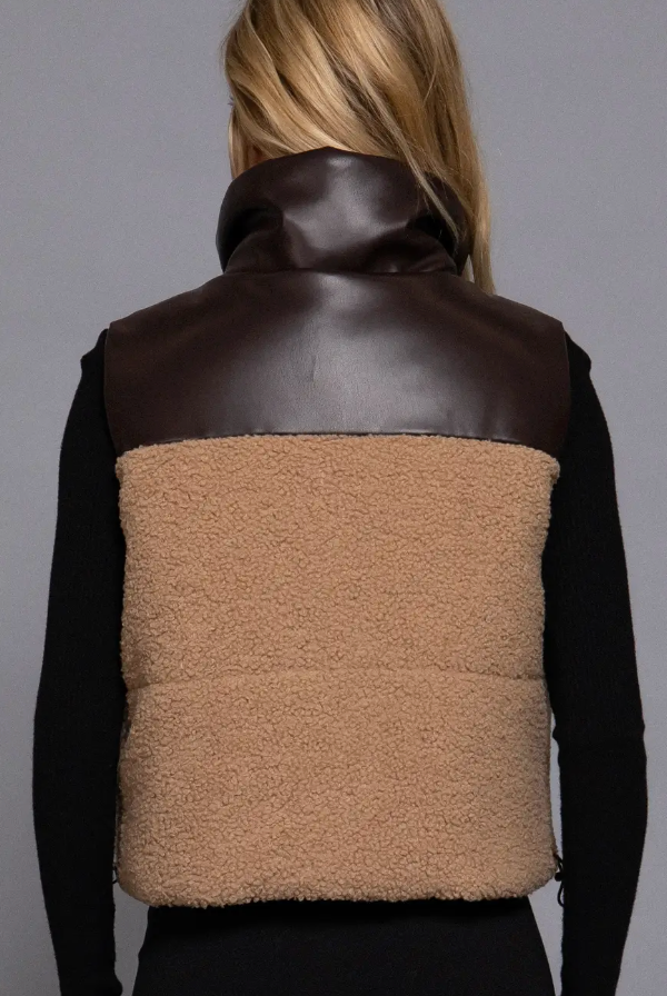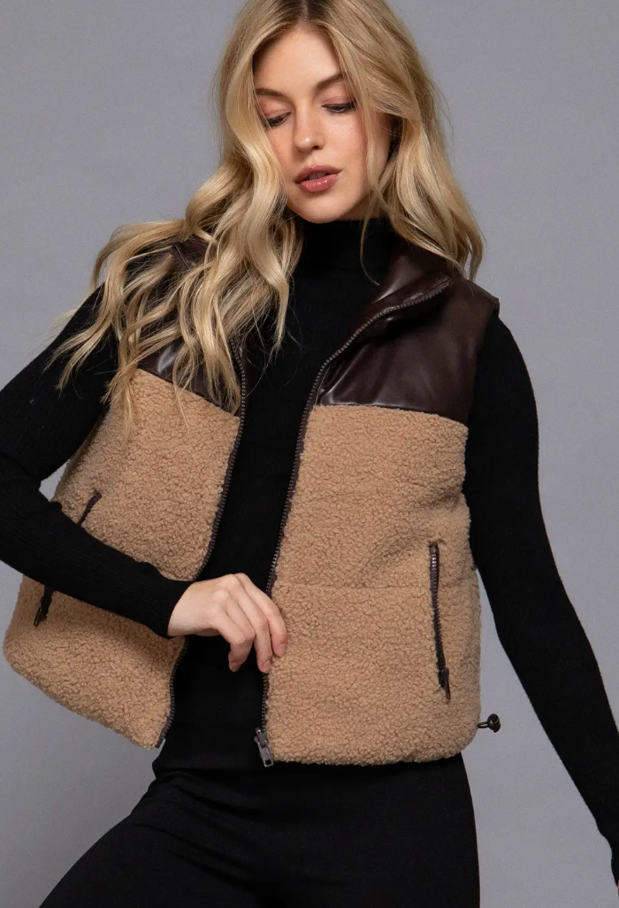 Turn heads and stay cozy with this ultra-stylish, reversible crop vest. One side features sleek, high-shine faux leather for an edgy, street-style vibe, while the other reveals plush sherpa for a soft, cozy contrast. Designed with eye-catching padded detailing and a cropped silhouette, this vest is the ultimate layering piece for transitional seasons.