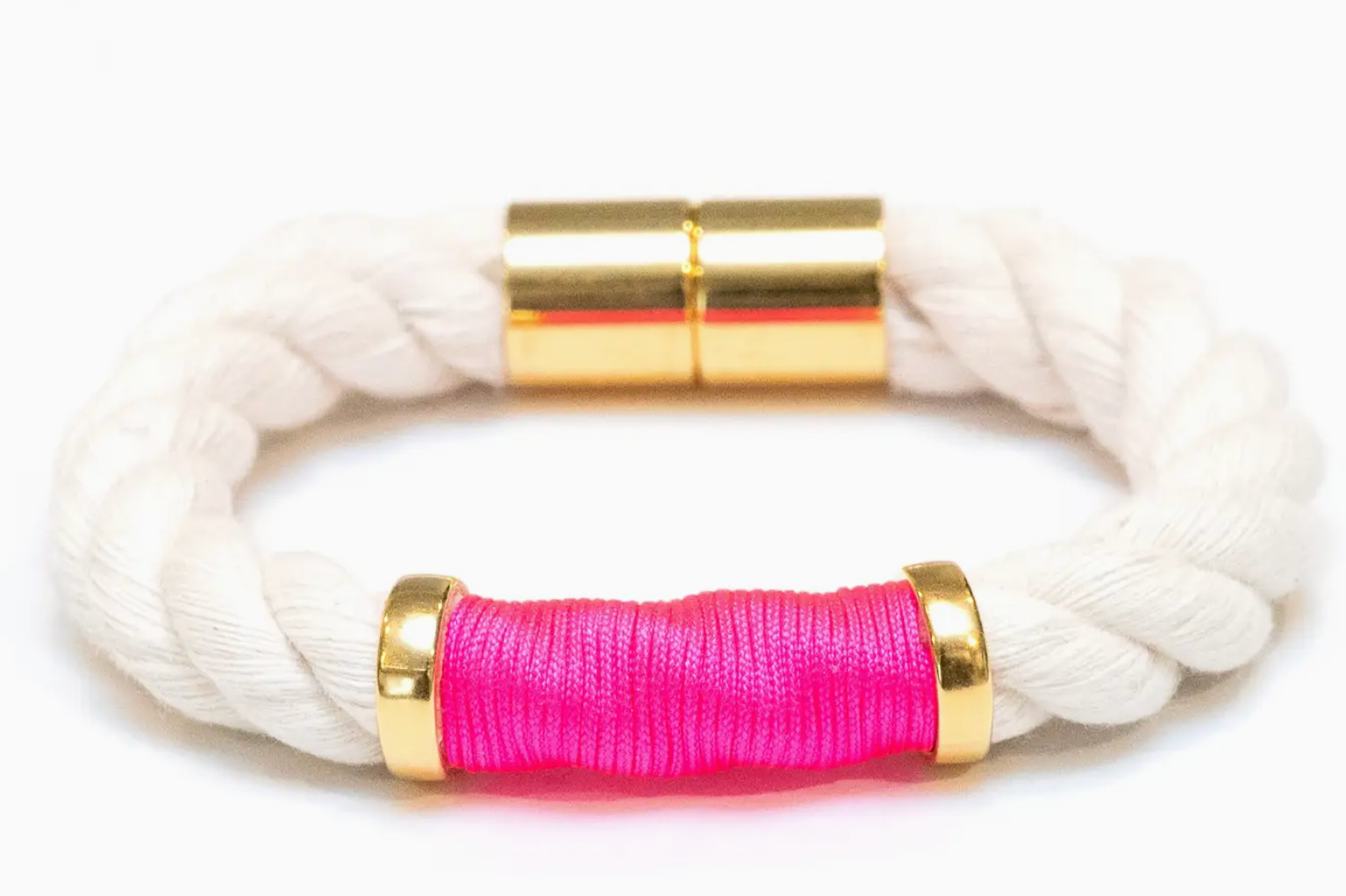 Brighten up your wrist stack with this bold yet breezy bracelet. Crafted from natural ivory cotton rope, it features a secure magnetic clasp and luxe gold-plated spacer beads. A vibrant hand-wrapped hot pink thread detail adds a playful pop of color, blending nautical-inspired texture with modern style. Perfect for adding a fun, fresh twist to your everyday look.