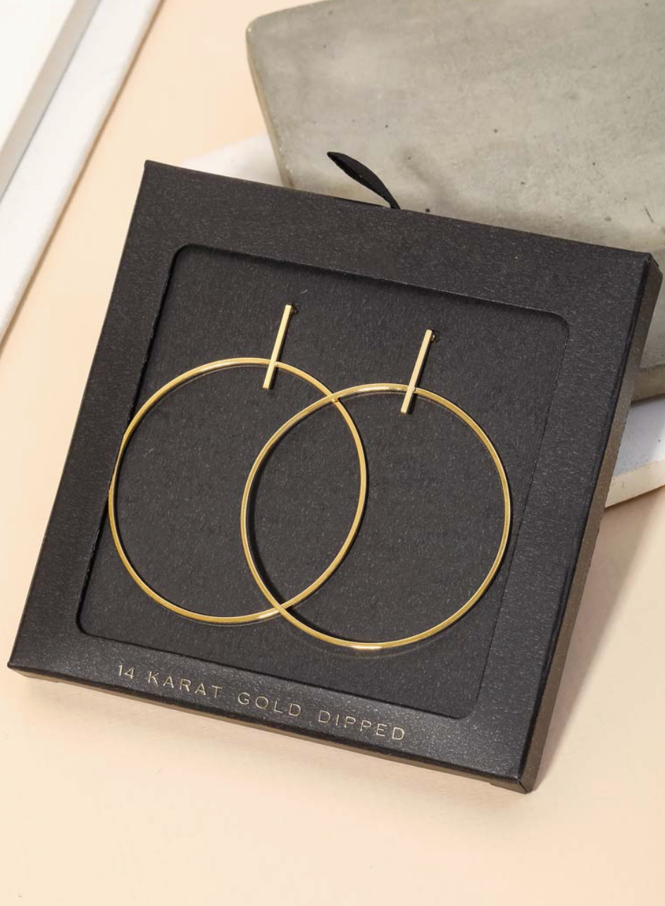 his stunning pair of gold dipped earrings features a secret box gold dipped thin hoop drop earrings design. An excellent choice for casual to formal occasions, goes perfectly with business formal work office suits blazer and dresses office attire.