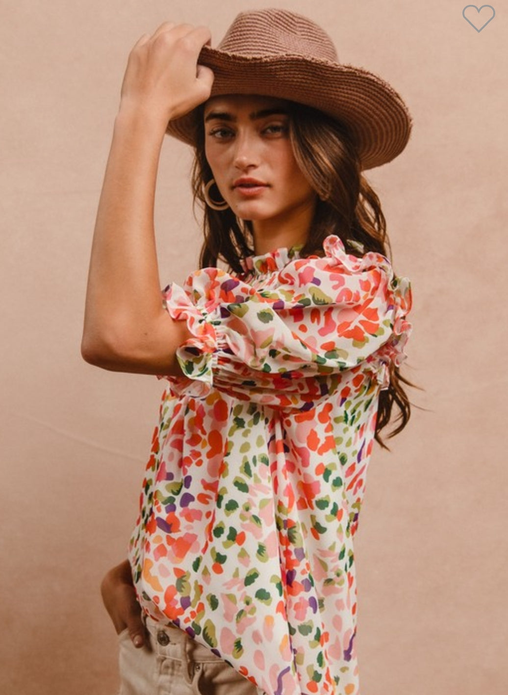Unleash your wild side with our Christine top. Featuring a fierce multicolor leopard print, this lightweight chiffon blouse brings a bold touch to any look. Delicate ruffle detailing adds a flirty, feminine flair, while the soft inner lining ensures coverage and comfort. Perfect for dressing up denim or adding drama to tailored trousers.
