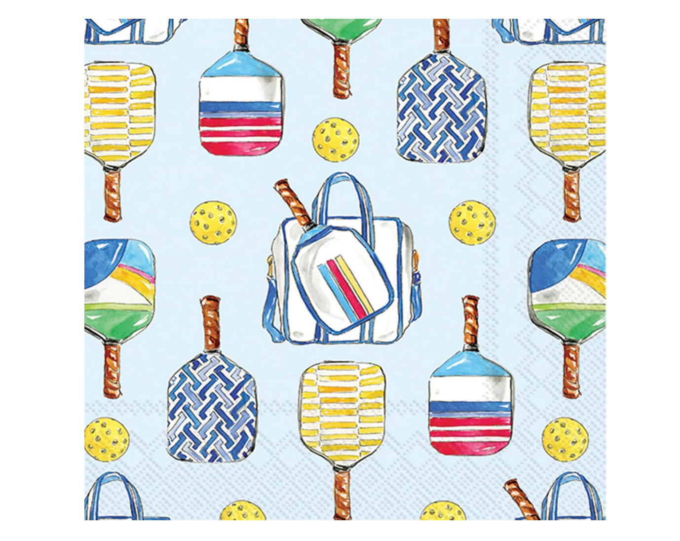 Serve up serious style with these playful pickleball-themed napkins—perfect for game day gatherings, backyard BBQs, or gifting to your favorite paddle pro! Featuring colorful illustrated paddles, balls, and sporty duffle bags against a light blue background, these napkins add a fun, sporty touch to any table.