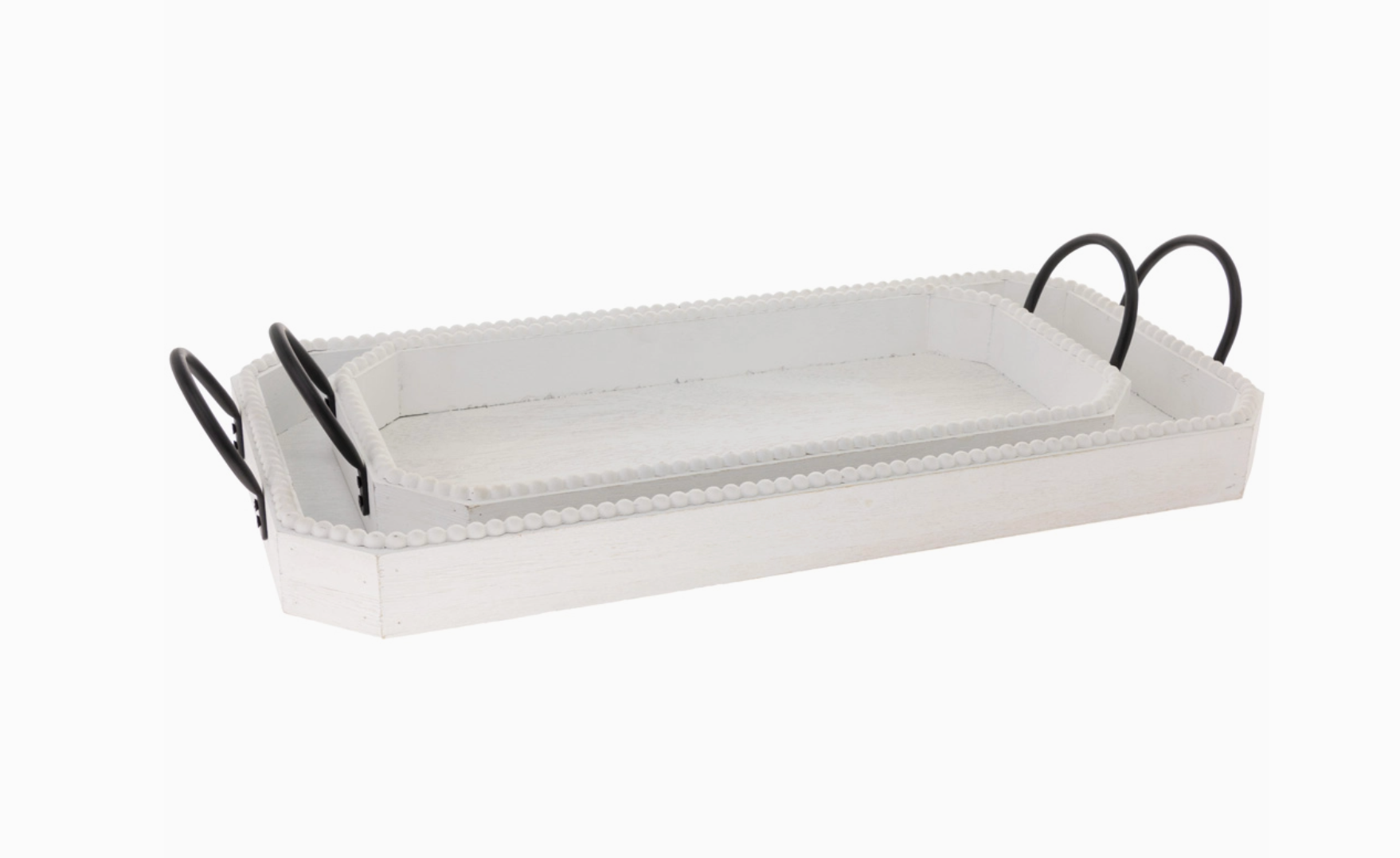 Each tray features a crisp white finish accented by a delicate beaded edge and sleek black metal handles for a touch of modern contrast. Perfect for serving, styling, or displaying, these trays elevate everything from everyday gatherings to special occasions.