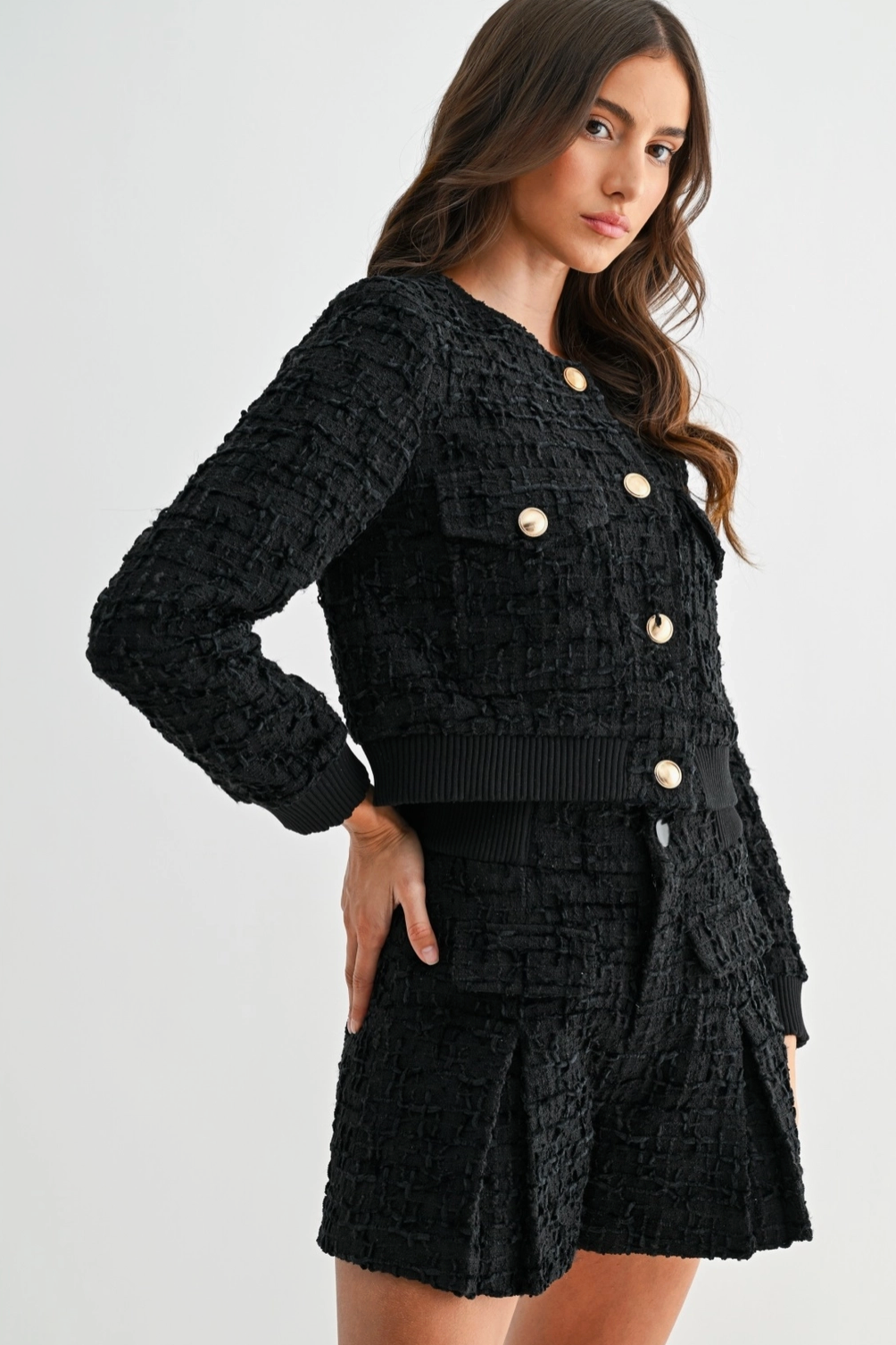 It features a round neckline, long sleeves, and elegant gold-toned statement buttons down the front. The jacket includes two front flap pockets on the chest, adding a touch of classic sophistication. Ribbed knit details at the cuffs and hem create a subtle contrast, giving the piece a modern edge.