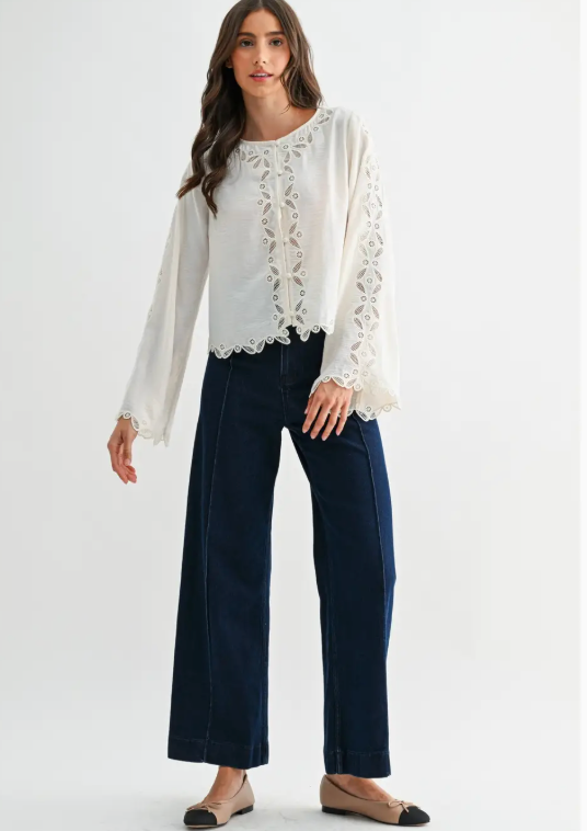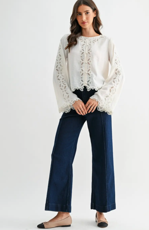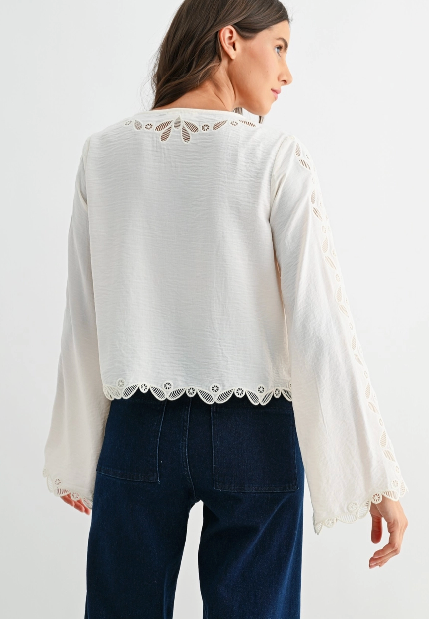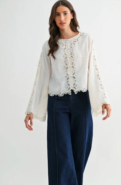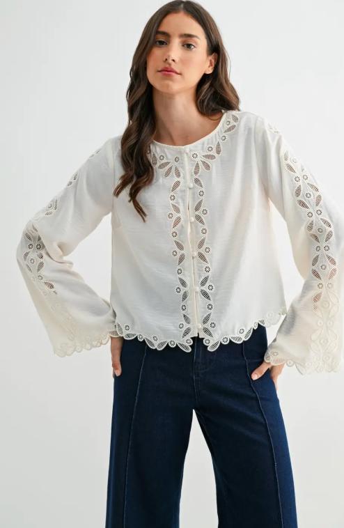 This is a delicate ivory long-sleeve blouse featuring intricate scalloped lace embroidery along the front placket, sleeves, and hem. Made from a lightweight, semi-sheer fabric, it offers a soft drape and a slightly textured finish. The top includes a round neckline and fabric-covered buttons down the front, adding a vintage-inspired touch.
