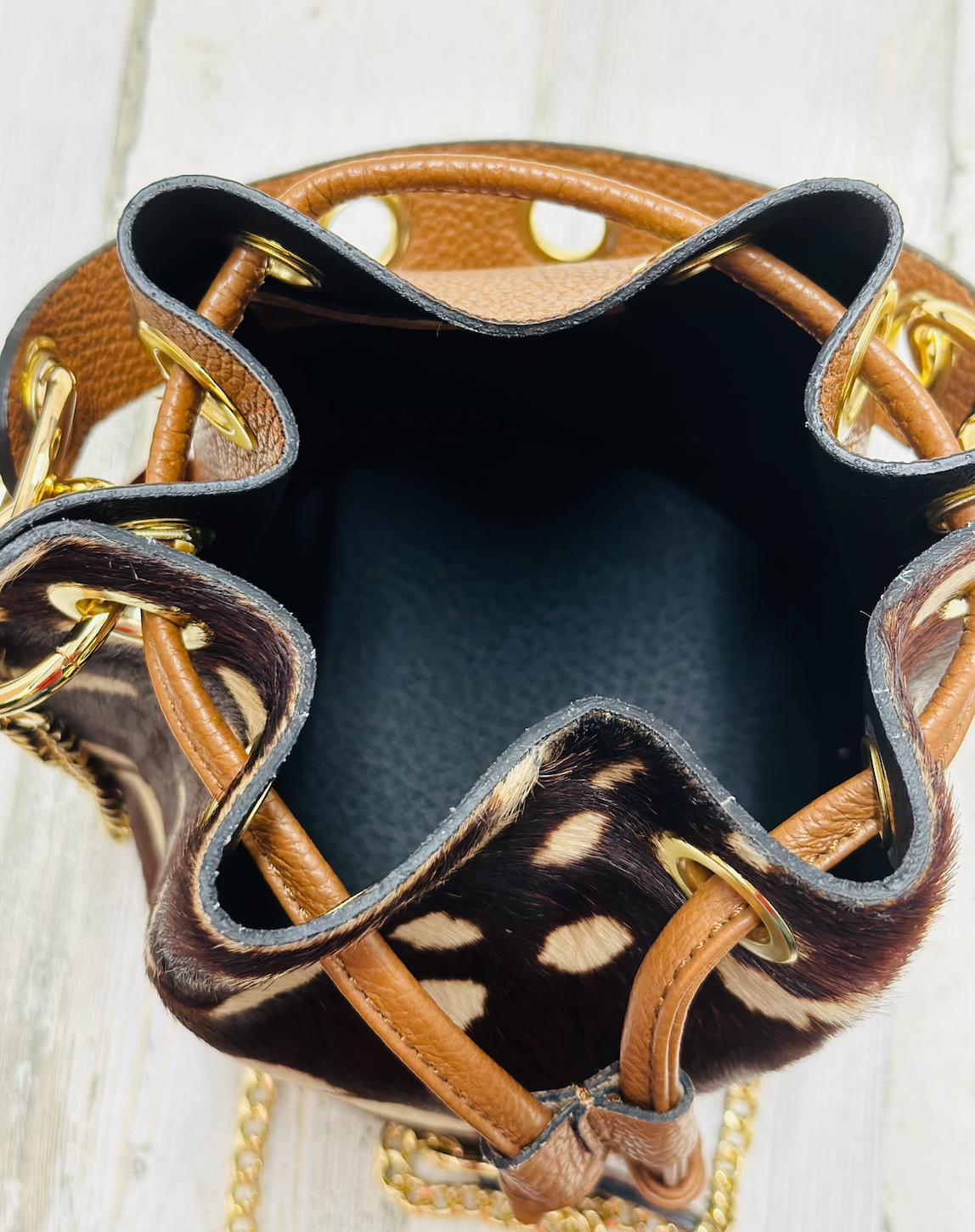 Show your wild side with this adorable mini bucket bag from Charlie leather. Made from real leather and fur this luxurious bag is sure to turn heads. Features gold hardware and comes with two strap lengths.