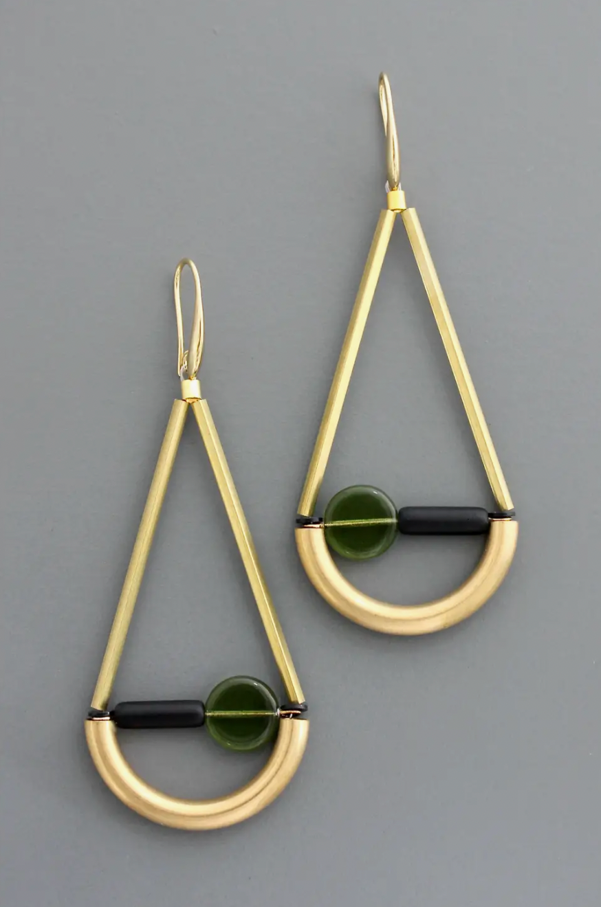 Gold plated brass hooks with brass and glass beads. Each earring weighs .17 oz. and measures 3.5 inches long. All pieces are handcrafted at our studio in New Jersey by skilled artisans who share our passion for quality and originality. Each piece is unique so stones and glass may vary in shape, size, and color. Stone inclusions may be visible to the eye and are considered a part of their beauty