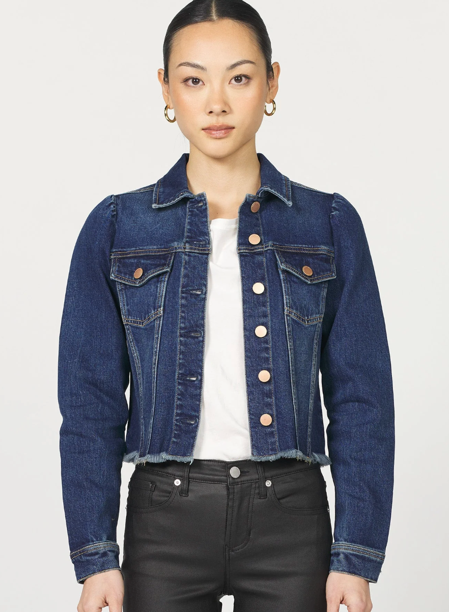 Pair your ensemble with the effortlessly chic Roselyn denim jacket in the perfect deep wash. It features playful puff sleeves and a tailored fit that instantly elevates any outfit. The fray hem and destructed detailing add a touch of modern edge, making it the perfect blend of classic and contemporary style.