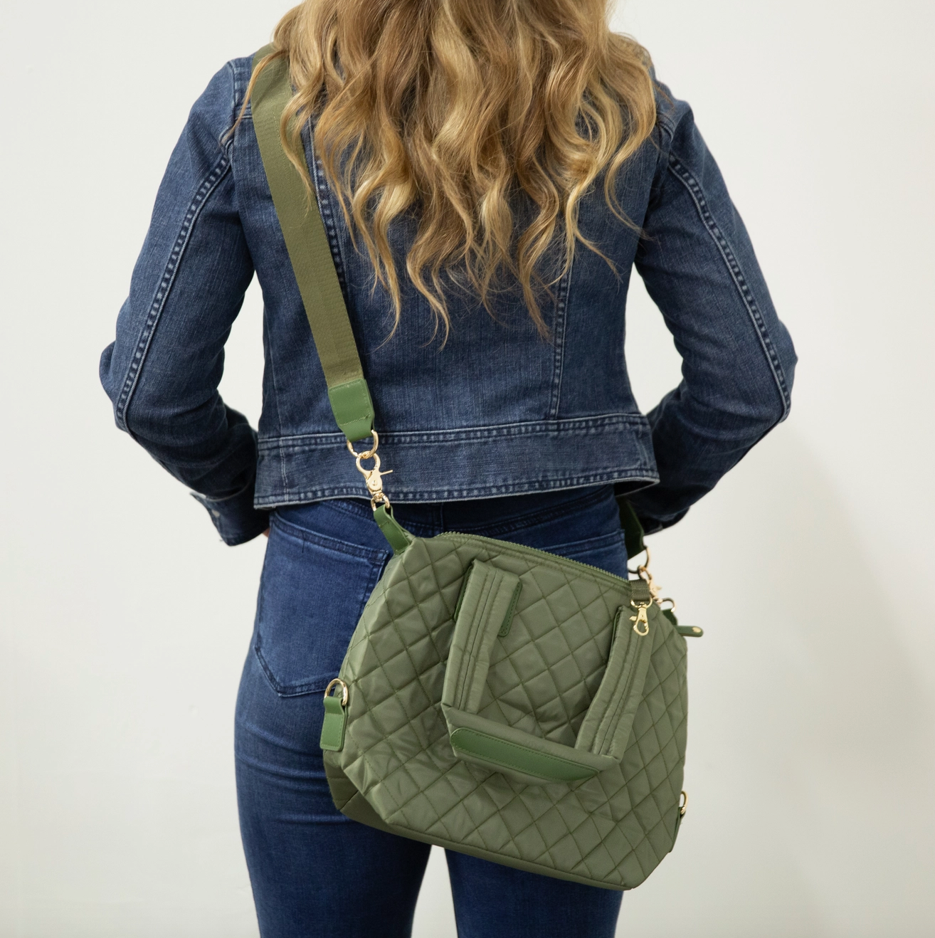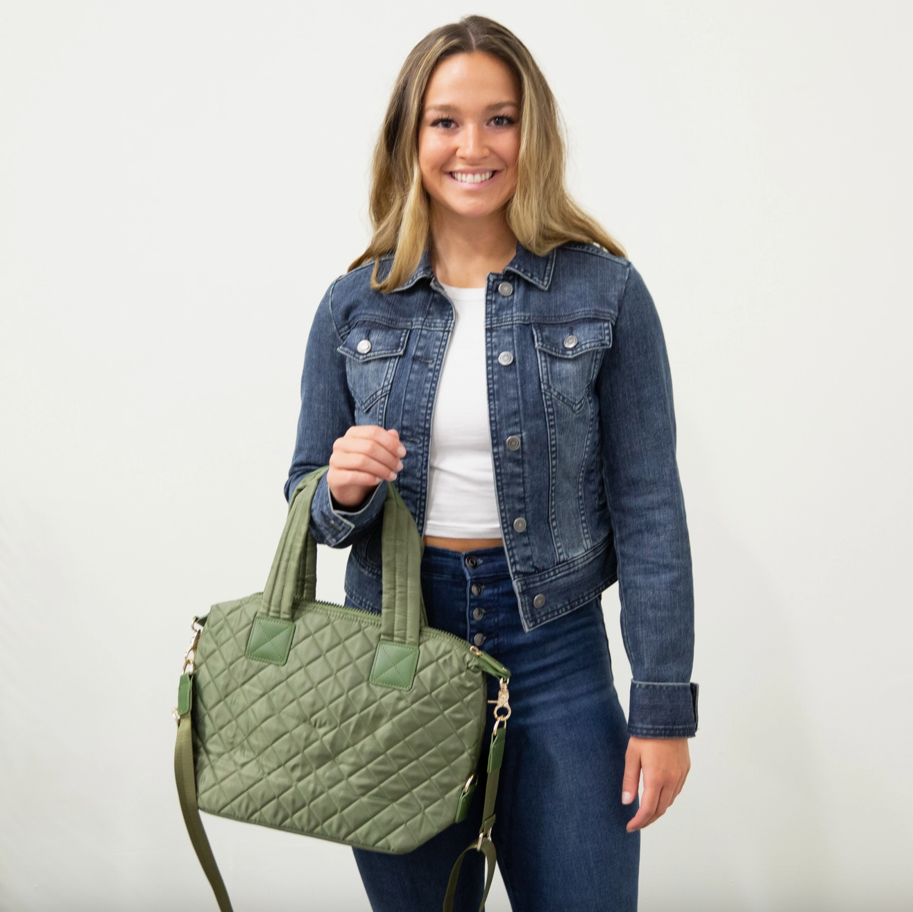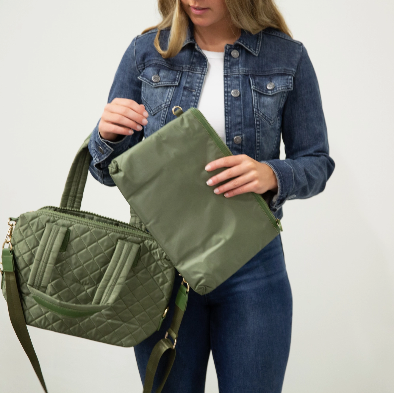The Madelyn two-piece collection in olive consists of a quilted crossbody and a pouch. The Madelyn set is perfect for every day life and traveling. Spacious enough for all of your essentials and the best way to stay organized on the go. Both stylish and lightweight, the Madelyn crossbody has a black quilted exterior, an adjustable/removable strap and faux leather detailed handles. Perfectly sized to fit the pouch with all of your essentials.