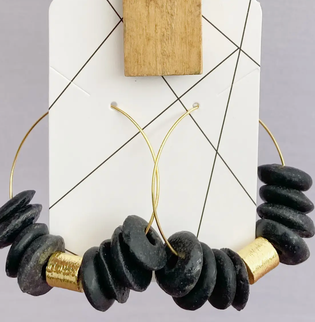 Make a statement brass hoops with Ashanti glass, black glass, and gold wood beads. Fun, bold, and versatile