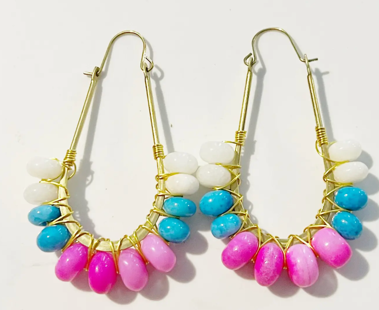 Bright and fun—pink jade & turquoise beads on hoop dangle earrings for a playful statement.