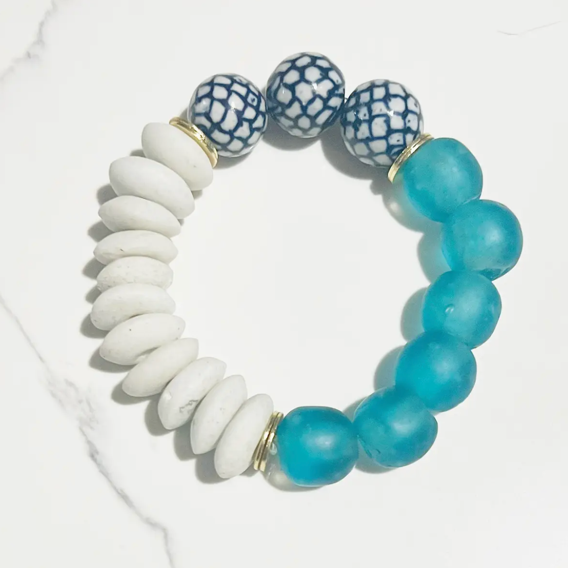 Stack, stretch, and shine—this bracelet features white Ashanti beads, turquoise recycled glass, brass accents, and a hand-painted chinoiserie bead for a bold yet effortless look.