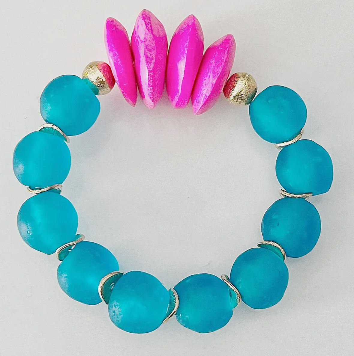 A vibrant bracelet with blue round beads, gold spacers, and pink disk-shaped accents.