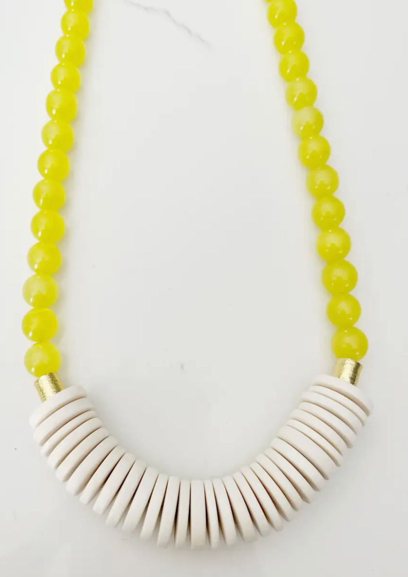 Bright and bold yellow cat’s eye gemstones with white coconut wood beads create a fun, midi-length statement necklace.
