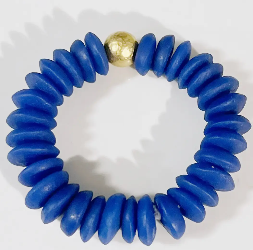 Elevate your style with this blue Ashanti glass bead bracelet. Featuring vibrant, bold blue glass beads with a single striking gold tones accent bead.