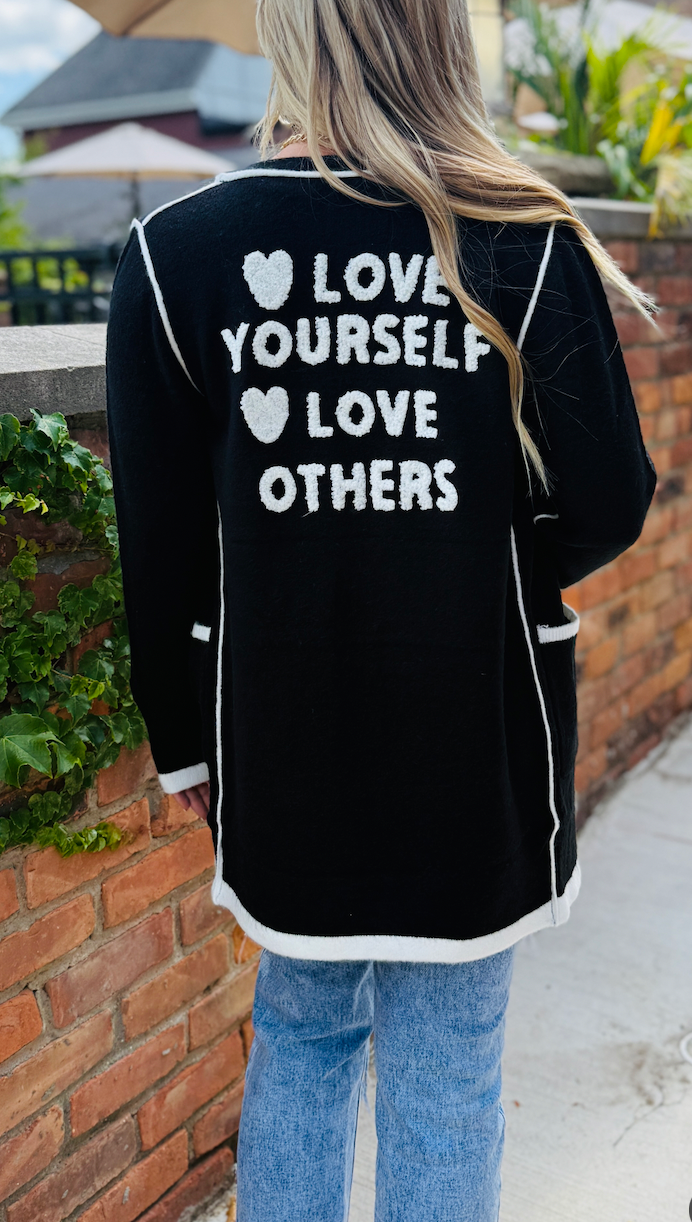 Elevate your wardrobe with this cozy cardigan. This uber-soft, grey, sweater features an important message embroidered on the back. The long sleeves and open front make it a perfect choice casual and travel occasions.