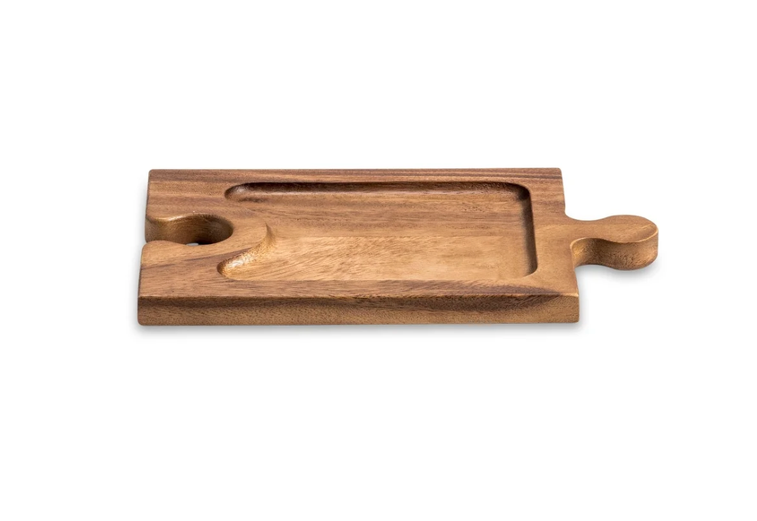 Fun and functional way to create a gorgeous charcuterie display while providing guests an option to conveniently hold a wine glass while enjoying appetizers. Puzzle piece shaped serving tray conveniently holds appetizers and a wine glass. attach puzzle pieces together to create a gorgeous display which allows for individual boards to be separated and used. Handcrafted from solid acacia wood, a high-quality hardwood great for culinary applications.