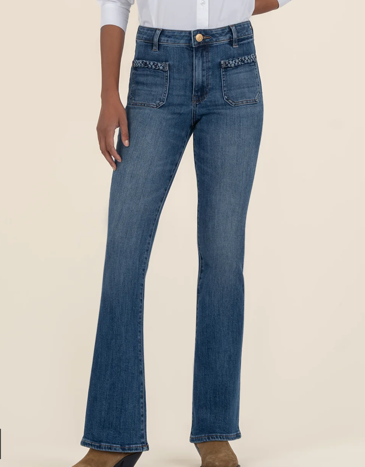 these high rise flare jeans feature braided patch pockets for a touch of vintage flair. Crafted from soft, stretch denim in a perfectly faded wash, they hug in all the right places while offering all day comfort. A timeless silhouette for casual days or dressed up nights.