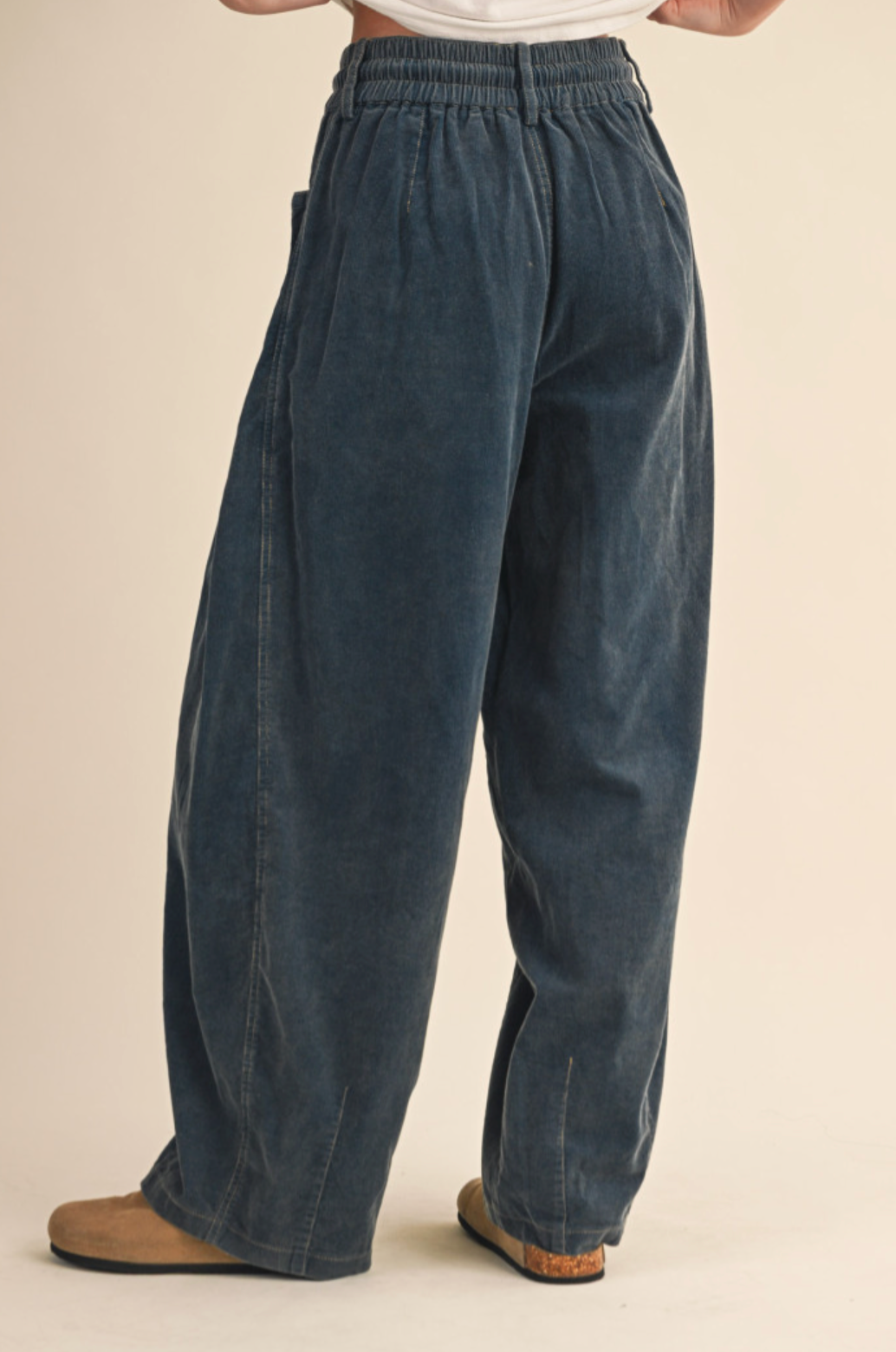 These trendy washed corduroy pleated barrel pants are just right for the changing of the seasons! Sturdy washed corduroy fabric shapes these stylish bottoms with a high drawstring waist and barrel-cut pant legs that fall to ankle-length hems. Oversized pockets with pleating detail adds a unique touch.