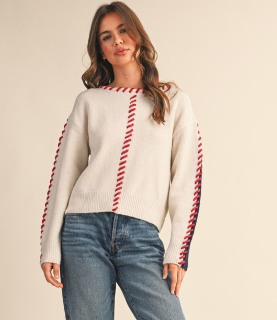 Show your stars and stripes spirit in style with this red, white, and blue whip stitch sweater. Featuring bold whip stitch detailing and a relaxed, boxy fit, this sweater brings laid-back vibes with a statement-making edge. The breathable knit makes it perfect for cool summer nights or layering year-round.