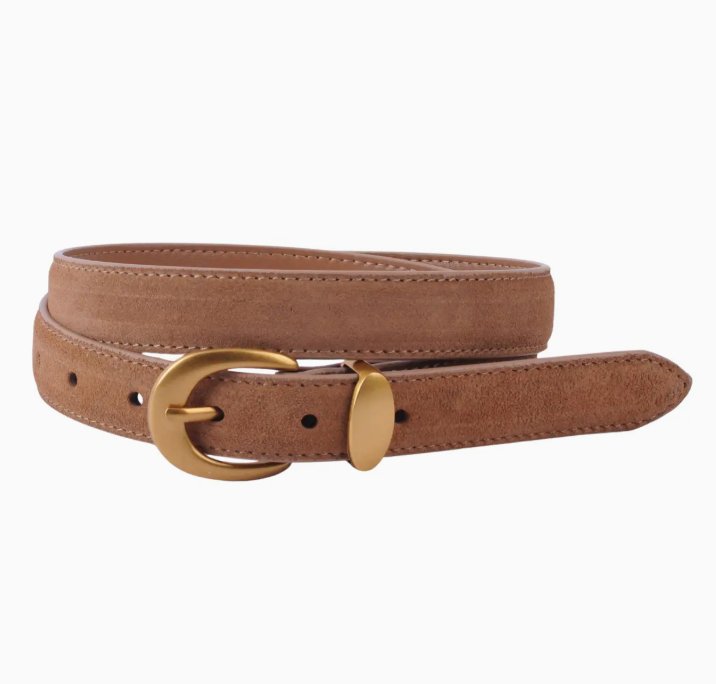 Elevate your look with our suede belt featuring a chic gold curve buckle. Crafted from luxurious suede, this timeless accessory brings a touch of old money elegance to any outfit. Whether you're channeling effortless city girl cool or dressing up your favorite jeans, this belt is the perfect blend of trend and sophistication.