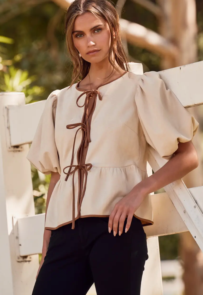 This faux suede jacket brings vintage romance with a modern twist. Designed with a flattering peplum silhouette, it features contrast binding for a tailored edge, puff sleeves for a touch of drama, and charming tie-front closures that set it apart. The soft, suede-like feel adds richness, making it the perfect layering piece to elevate any look—from casual denim to sleek trousers.