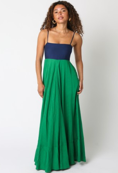 Turn heads in this effortlessly elegant maxi dress, featuring a striking contrast of colors. The dress boasts a rich green flowing skirt that drapes beautifully to the floor, creating graceful movement with every step. The bodice stands out in a deep, dreamy blue, adding a bold yet refined touch to the overall look. With its flattering silhouette and eye-catching color combination, this dress is perfect for garden parties, evening events, or any occasion where you want to feel both comfortable and chic.