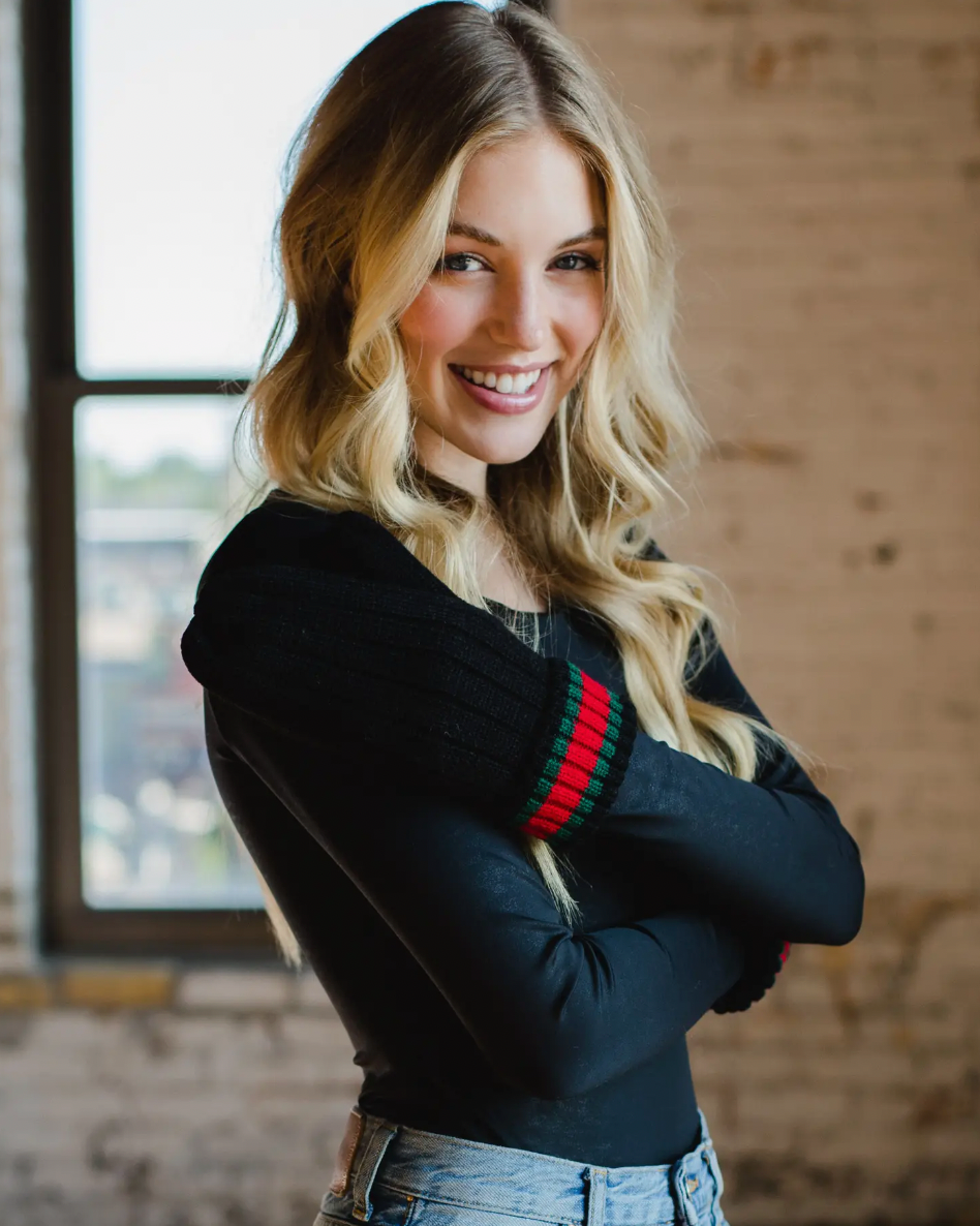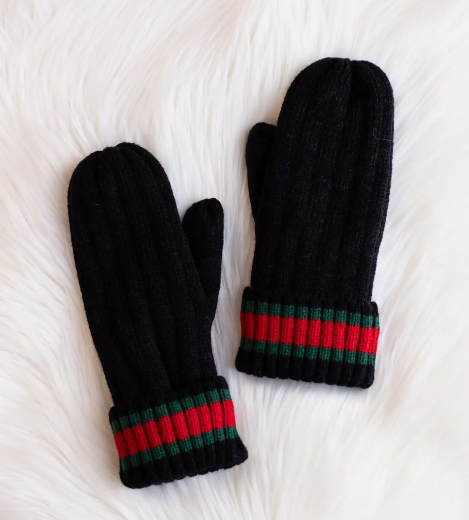 Stay warm in these fleece lined, black knit mittens with red and green striped details.