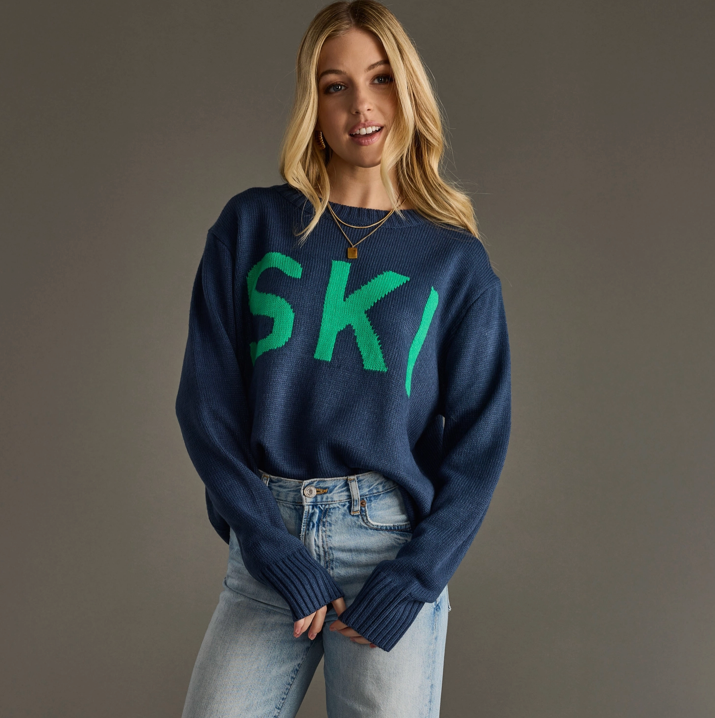 Hit the slopes or lounge in style with this playful Panache Apparel sweater. Designed in a rich navy knit with bold green lettering, it brings that perfect mix of cozy, sporty, and chic. The relaxed fit, ribbed cuffs, and soft feel make it an easy go-to for winter weekends, ski trips, or just looking like you’re headed to the lodge.