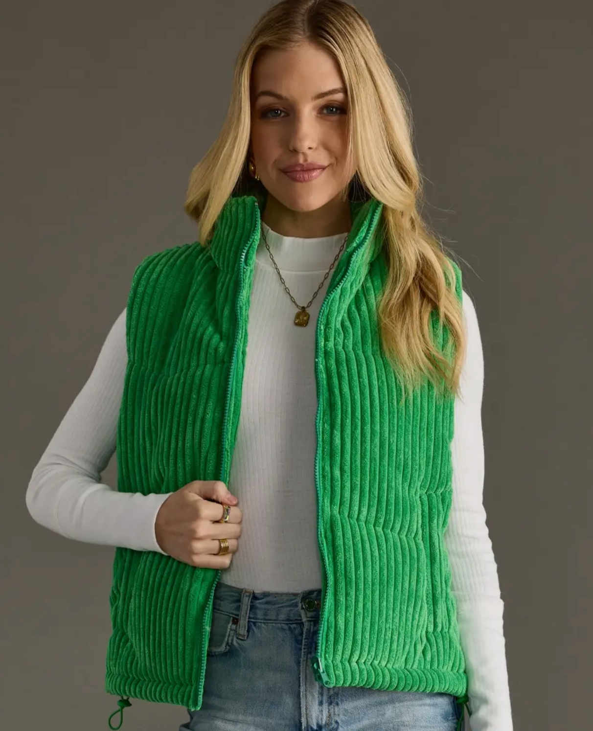 This Green Corduroy Vest features a rich texture with a modern edge. Designed with a front zipper and snap-button closure for a secure fit, plus two side pockets to keep your hands warm or essentials close. Layer it over a tee or sweater for an easy, stylish upgrade.