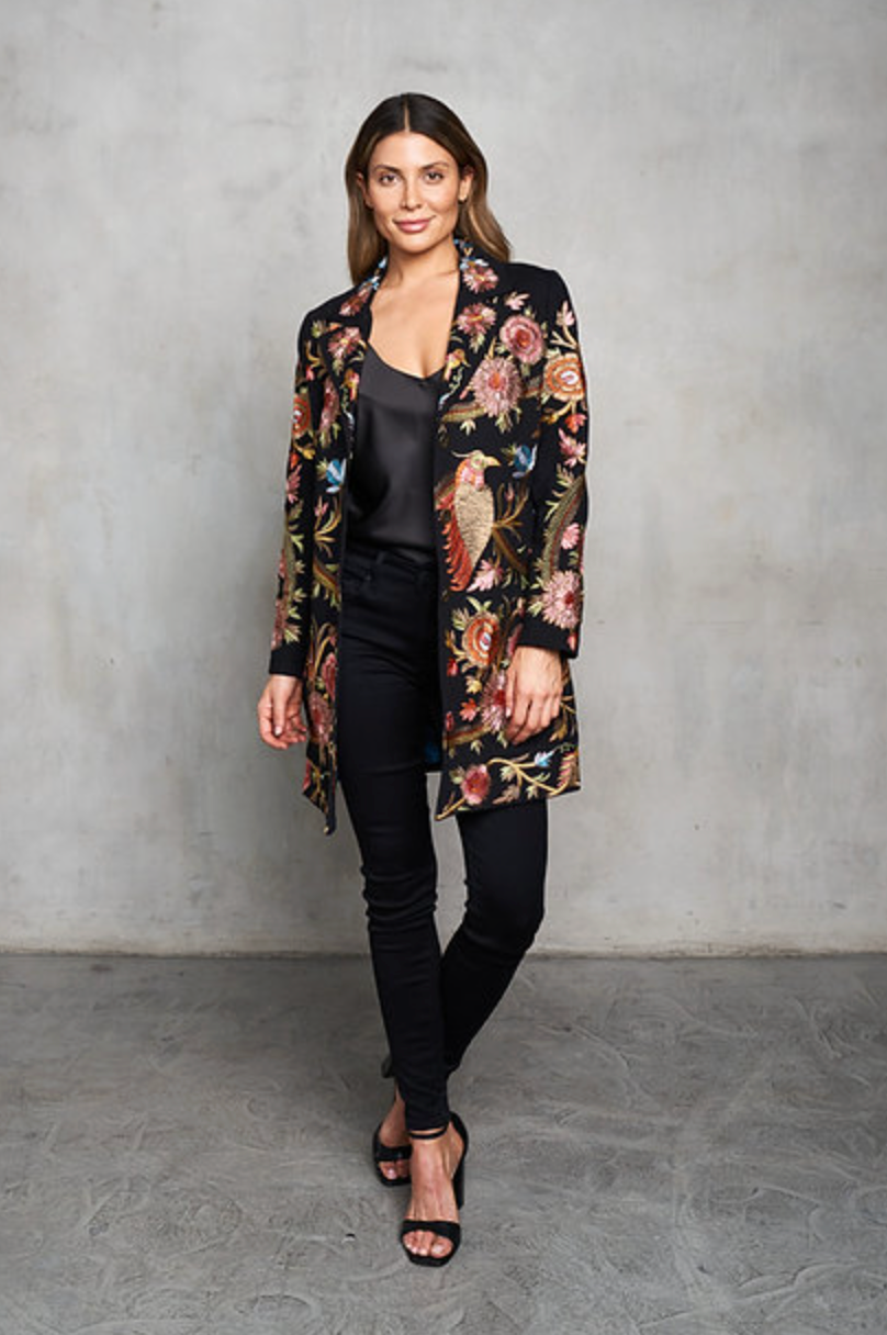 Embroidered twill coat, multi-color bright bird and floral embroidery front, back, and sleeve detail, single breasted, notch collar, inseam side pockets, fully lined with embroidered quote, straight hem.
