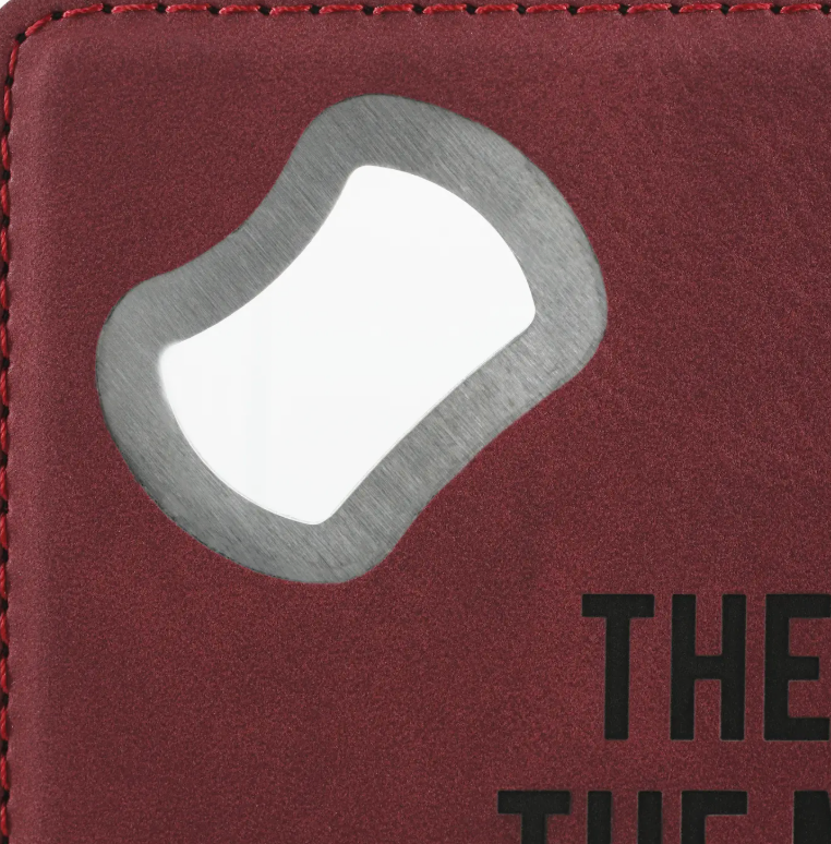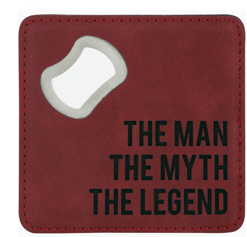 4" square dual-purpose bottle opener/coaster, packaged in a plastic polybag, is made from stainless steel, vegan leather, and faux suede. "The Man The Myth The Legend" text is laser-printed onto the front of the bottle opener/coaster. Wipe clean with a damp cloth.