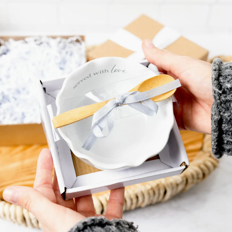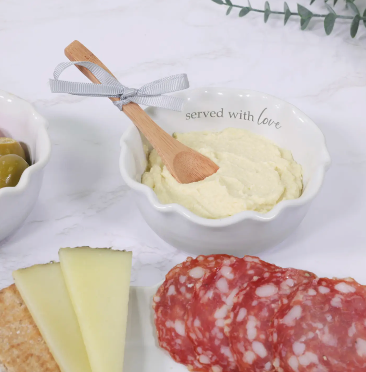 4.5" round & 2" tall serving bowl organic-shaped ribbed stoneware vessel and bamboo wood serving spoon will fit into modern neutral-styled homes. Prop 65 approved - excellent for hosting in the house and supplying guacamole, hummus, bean, artichoke, spinach, cheesy or french onion dips, among many others. You will see cursive written "Served with Love" wrapping around the interior brim of the mortar.