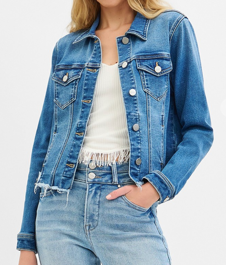 Add a touch of edge to your everyday look with the Risen fray hem denim jacket. This modern take on a classic staple features a relaxed fit and distressed frayed hemline for that effortlessly cool, lived-in vibe. Crafted from soft yet durable denim, it’s perfect for layering over your favorite tees, dresses, or sweaters. Thoughtful details like chest flap pockets, metal hardware, and subtle fading give it timeless appeal with a contemporary twist.