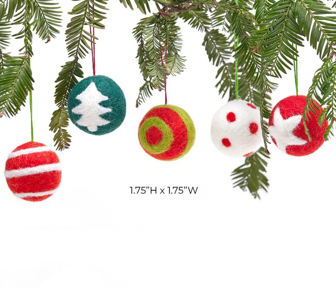 This adorable set of 5 felt ornaments adds extra charm to your holiday tree! Each Christmas ball has its own festive design; a red and white stripe, a blue and white tree, green and red bold stripe, red and white polka dots, and a red and white star.