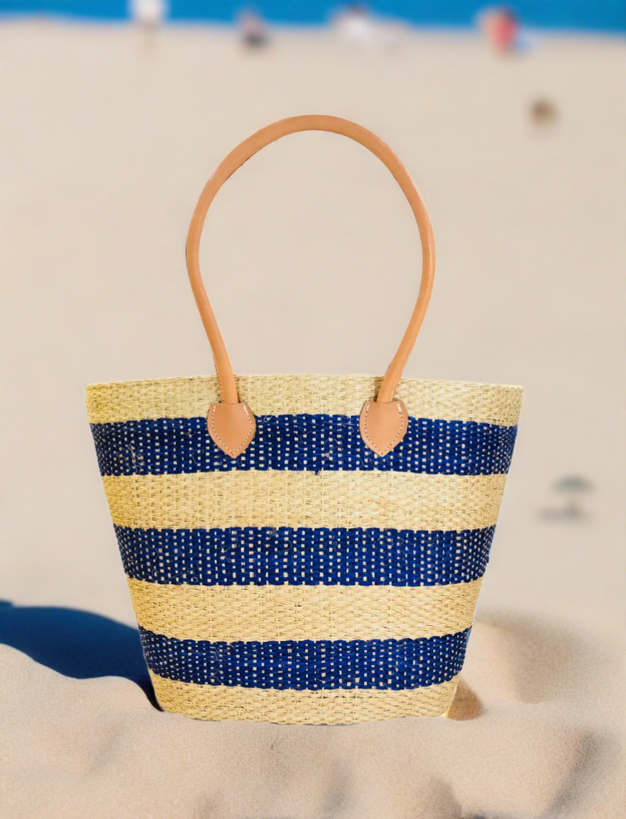 The perfect summer large beach tote. Navy and rattan tote with brown leather straps.