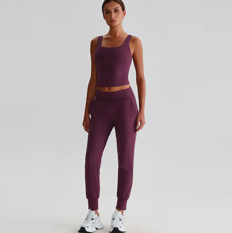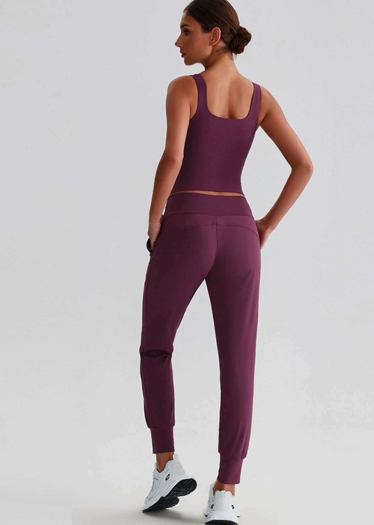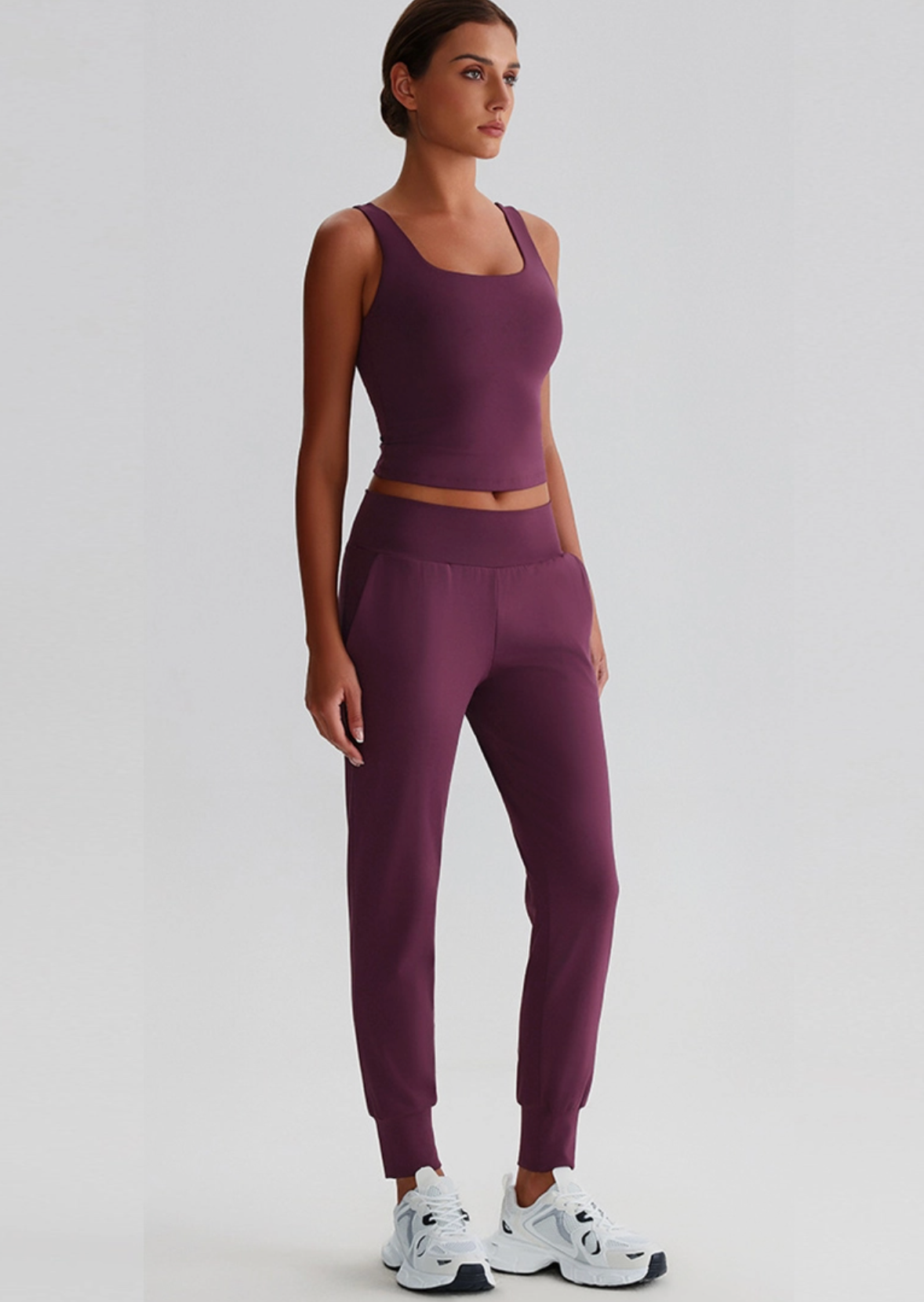 This two-piece set features a sleek sleeveless crossover sports bra paired with high waisted long pants, designed to support your active lifestyle in style. Made from high stretch, eco-conscious fabric, it offers a sculpting fit with just the right amount of mid weight support. Crafted from soft, brushed knitted fabric, the set ensures breathability and comfort whether you're running outdoors, working out at the gym, or styling it for casual wear.
