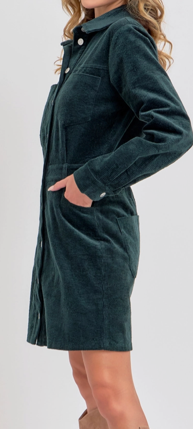 Slip into effortless style with this cozy corduroy dress in a gorgeous hunter green. Featuring charming button details and practical back pockets, this sweet and lovely dress delivers comfort without compromising on charm. A wardrobe essential that feels as good as it looks.