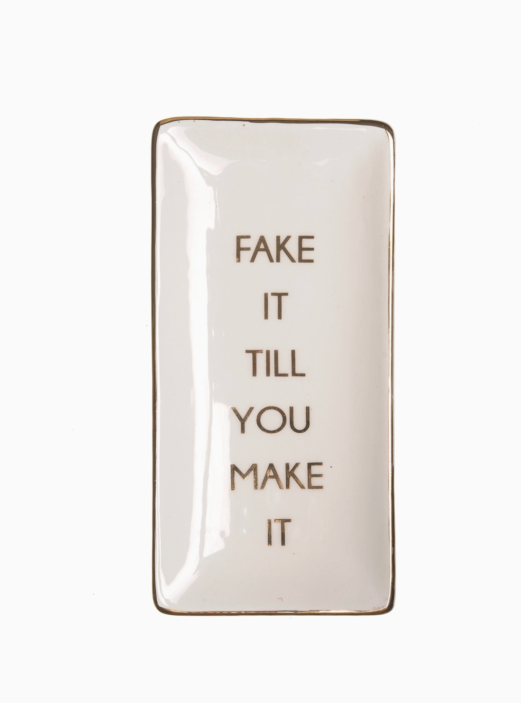 “Fake It Till You Make It.” Perfect for holding rings, earrings, keys, or coins, this chic little catch-all adds a dose of humor and hustle to your vanity, desk, or nightstand. Made from durable ceramic with a sleek finish, it’s the perfect reminder that you’ve got this—even if you’re still figuring it out.