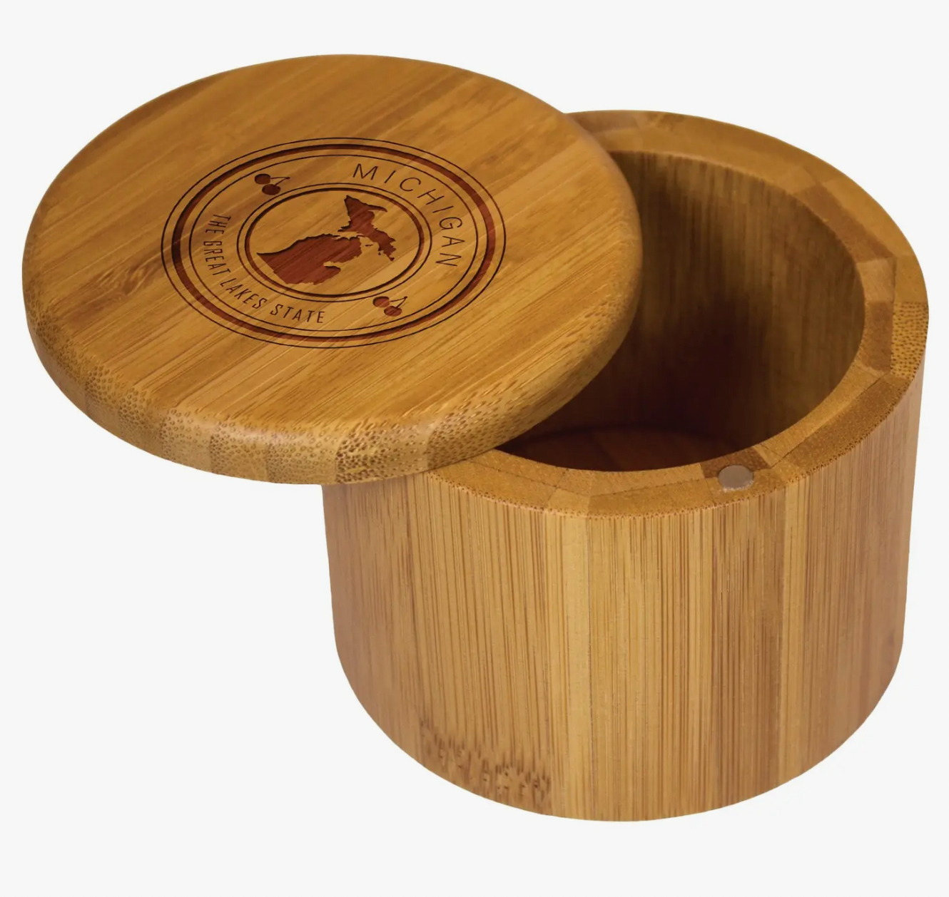 Add a bit of local flavor to your kitchen assortment with this Michigan stamped storage box. Keep your favorite salt or spices safe in the cylindrical box with a magnetic lid. Crafted from natural, sustainable bamboo, and measures 3-1/2" x 2-3/4" with a 6-oz. capacity.