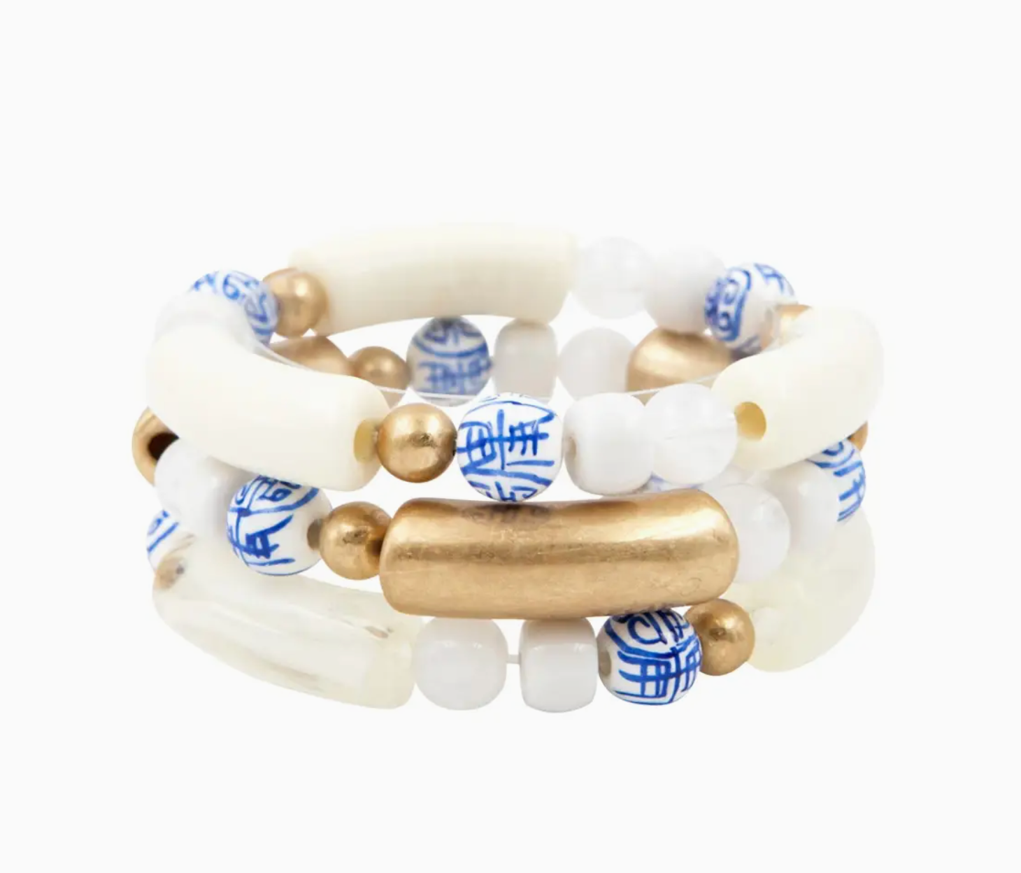 Add this adorable white and gold acrylic beaded stack bracelets to you jewelry collection. The Charlee bracelet come in a set of three and will look amazing this summer paired with your favorite pair of white denim.
