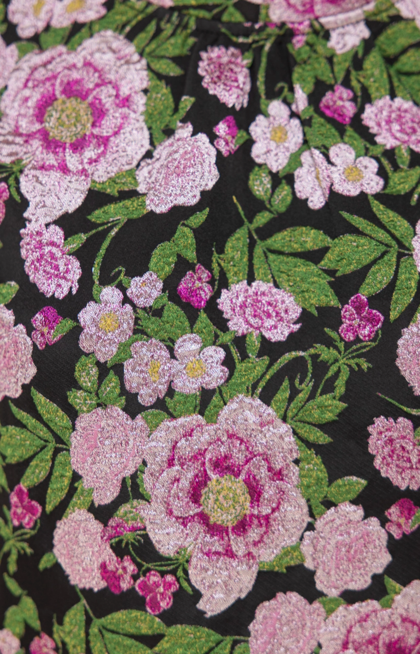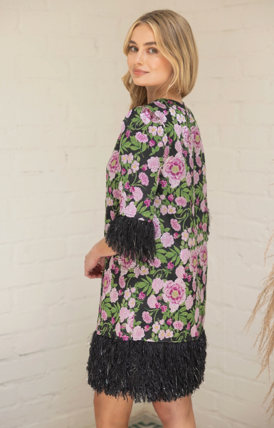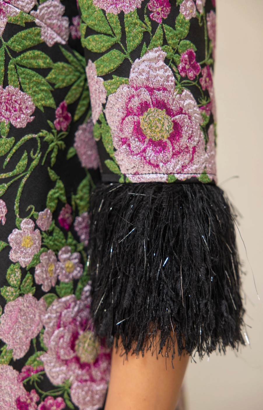 Elevate your wardrobe with this chic and feminine jacquard top, designed with thoughtful details that set it apart. Crafted from a luxurious floral jacquard woven fabric, it features a classic round neckline and flattering half sleeves. The cuffs and hem are adorned with dramatic ostrich feather fringe, adding playful movement and a touch of glamour. A delicate button-and-loop closure at the back completes the look. Perfect for both day and evening wear, this statement piece blends texture and elegance effortlessly. Model is 5'8" and wears a size Small.
