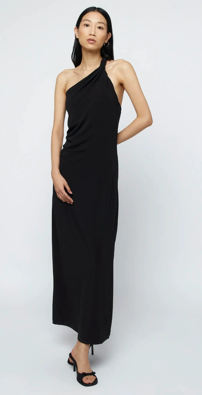 A little black dress is never a bad idea, and this one have a unique flair. The twisted, asymmetrical strap adds the right pop of elegance, while the black circular knit makes this comfortable dress an easy win.